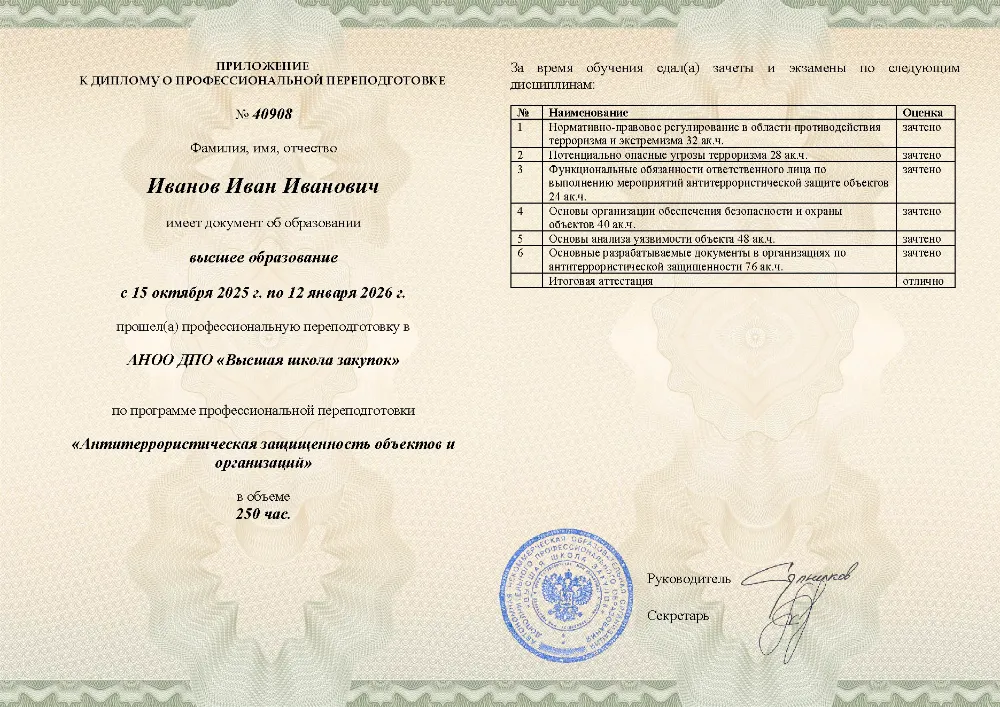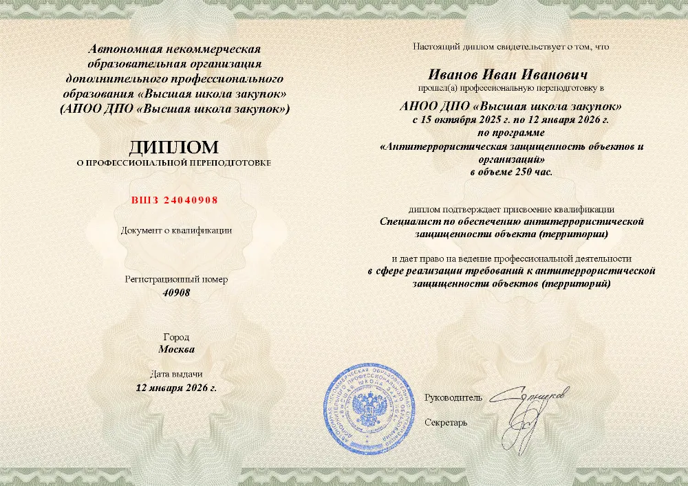 Программа профессиональной переподготовки объёмом 280 академических часов охватывает одиннадцать взаимосвязанных разделов: государственная политика и нормативно-правовое регулирование в сфере противодействия терроризму, организация системы антитеррористической защищённости, методы идентификации угроз и оценки уязвимости объектов, инженерно-технические и организационные меры защиты, алгоритмы действий при возникновении чрезвычайных ситуаций, а также регламенты взаимодействия с надзорными и контролирующими органами. Обучение проходит в онлайн-формате. Проведённый мониторинг рыночных цен подтверждает: данный курс — самый дешевый среди всех учебных центров, предлагающих аналогичную программу профессиональной переподготовки. Итоговая аттестация реализована в виде простого тестирования: не более 10 вопросов, без временных ограничений, количество попыток не ограничено. 99% слушателей успешно завершают обучение с первой попытки — без подготовки рефератов, дипломных работ и устных защит. Документ о квалификации (диплом) выдаётся уже на следующий день, а сведения о нём вносятся в ФРДО в день выдачи. Обучение в Ижевске и других городах осуществляется по индивидуальному графику без отрыва от работы.