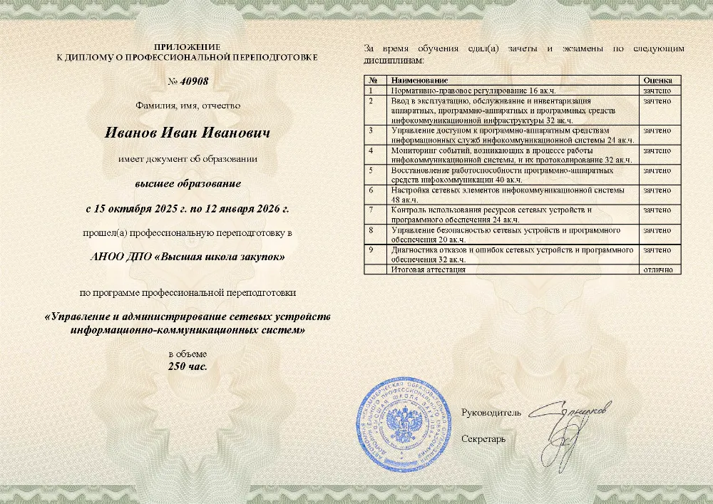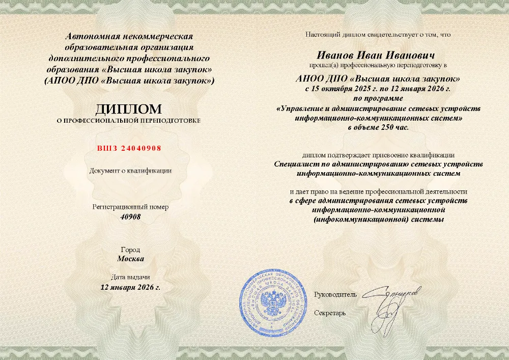 Профессиональная переподготовка, 250 академических часов, 9 модулей: нормативно-правовое регулирование и ввод в эксплуатацию, настройка и мониторинг сетевых устройств, управление доступом и безопасностью, диагностика и восстановление работоспособности инфокоммуникационных систем. Онлайн-обучение в в Ижевске с итоговой аттестацией.