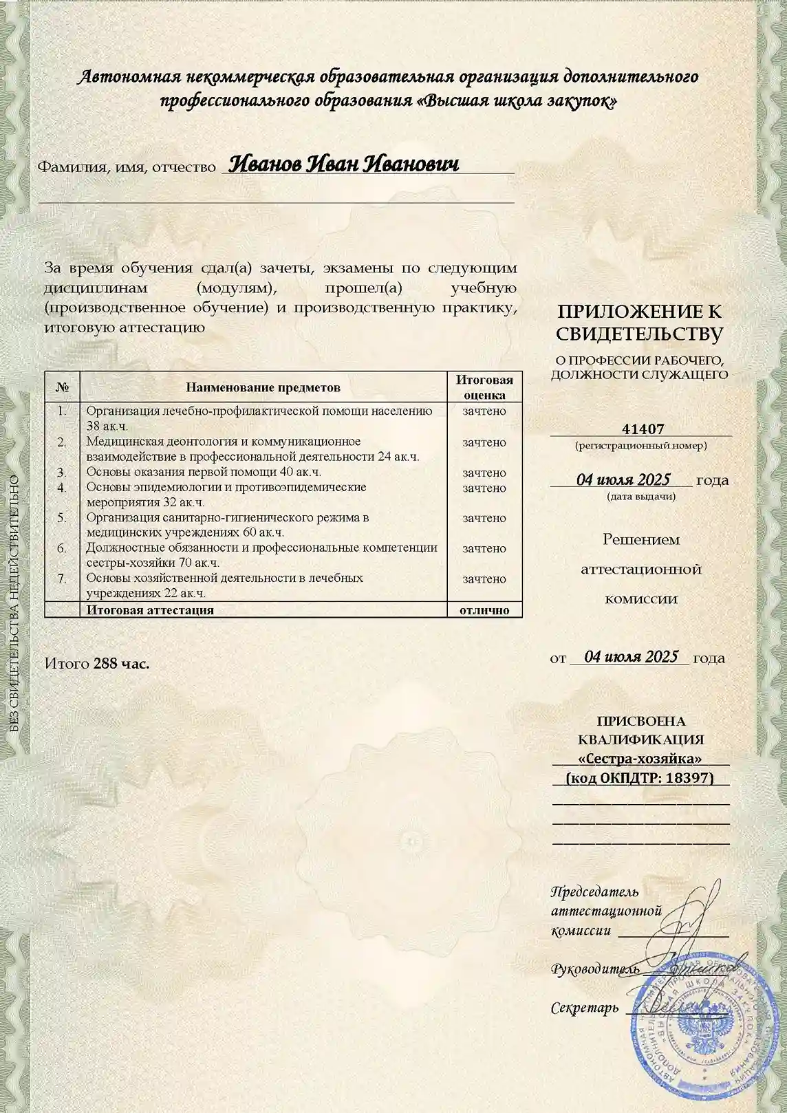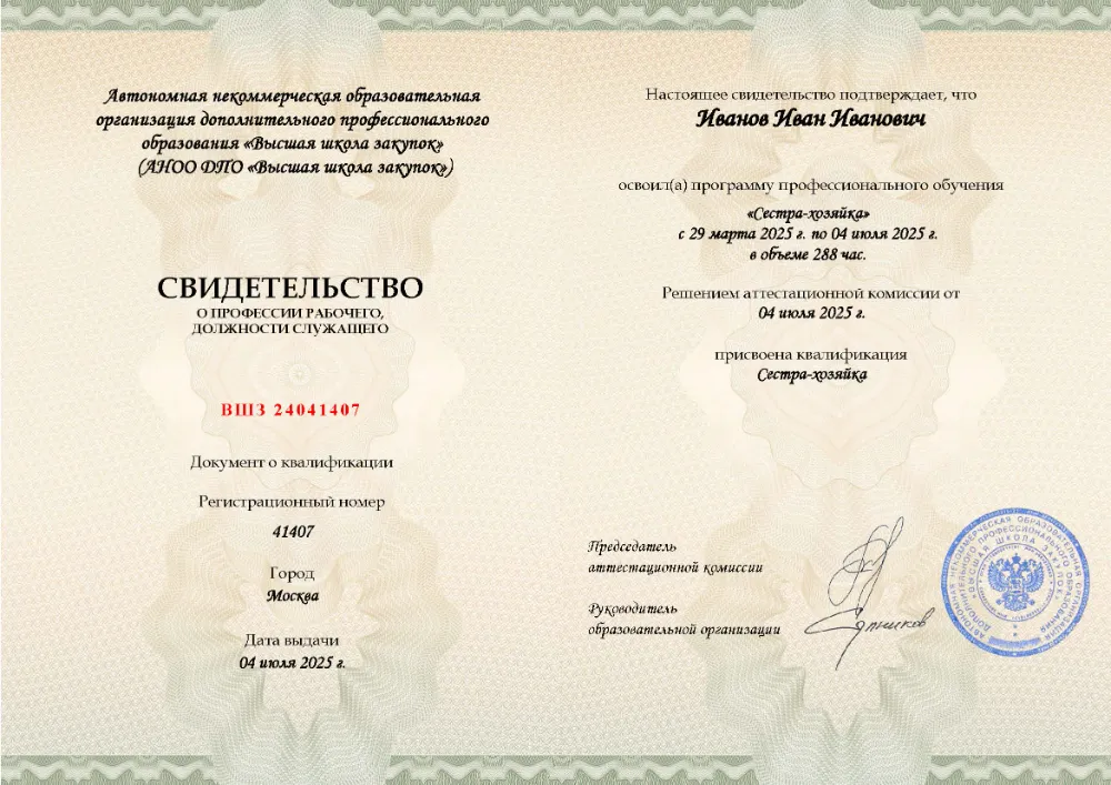Данный курс профессионального обучения объемом 288 академических часов разработан для персонала, ответственного за хозяйственное обеспечение и санитарный порядок в медучреждениях. Обучение проходит дистанционно в Ижевске. Программа детально рассматривает организацию санитарно-гигиенического режима в ЛПУ, основы эпидемиологии, нормы деонтологии и алгоритмы оказания первой помощи. Слушатели изучают полный перечень профессиональных обязанностей сестры-хозяйки. Итоговая проверка знаний максимально упрощена: онлайн-тест до 10 вопросов без лимита времени и количества попыток (99% успешно сдают с первого раза). Никаких рефератов и защит работ. Актуальный мониторинг подтверждает, что это наиболее бюджетный вариант обучения в своей нише. Диплом (свидетельство) оформляется за 1 день, а сведения в реестр ФРДО заносятся непосредственно в день выдачи.