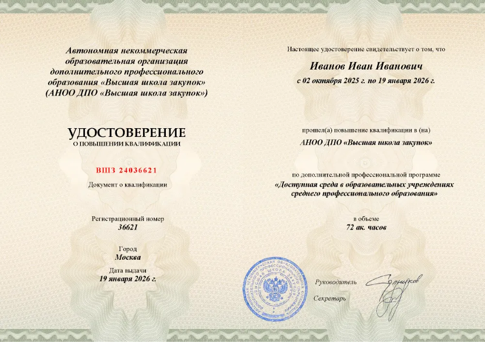 Курс повышения квалификации объемом 72 академических часа разработан для педагогов, руководителей и специалистов СПО, ответственных за инклюзивное обучение. Программа реализуется в дистанционном формате в Ижевске. Учебный план включает изучение законодательной базы инклюзии, регламенты паспортизации инфраструктуры колледжей и техникумов, а также методики взаимодействия с обучающимися, имеющими ОВЗ. Дополнительно рассматриваются вопросы педагогического контроля и эффективного тайм-менеджмента для преподавателей. Аттестация максимально упрощена: онлайн-тест до 10 вопросов без лимита времени и количества заходов (99% успешных сдач с первой попытки). Никаких рефератов и защит работ. Актуальный мониторинг подтверждает, что это наиболее бюджетный вариант обучения в своей нише. Удостоверение оформляется за 1 день, а сведения в реестр ФРДО заносятся непосредственно в день выдачи.