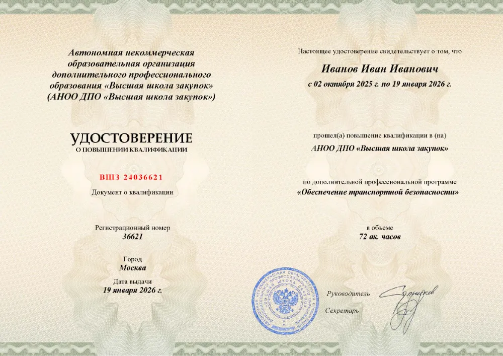 Повышение квалификации, 72 академических часа, 10 модулей: нормативная правовая база и система мер обеспечения транспортной безопасности, планирование и реализация защитных мероприятий, информационное обеспечение и государственный контроль, оценка состояния защищенности объектов. Онлайн-обучение в в Ижевске с итоговой аттестацией.