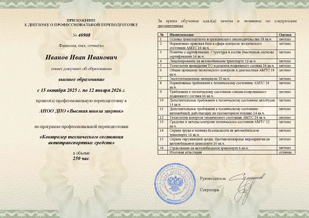 Программа профессиональной переподготовки, включающая 250 академических часов материала, предназначена для специалистов, ответственных за предрейсовый и технический осмотр автотранспорта. Заниматься можно полностью удаленно в Ижевске, совмещая учебу с основной деятельностью. Курс охватывает нормативную базу работы контролера, современные технологии диагностики, требования к безопасности транспортных средств, а также нормы охраны труда и экологии. Проверка знаний организована в формате несложного тестирования (до 10 вопросов) без ограничений по времени и количеству попыток, поэтому 99% обучающихся сдают всё с первого раза. Подготовка рефератов и защита работ не требуются. Сравнительный анализ цен доказывает: это самый бюджетный вариант обучения в своем сегменте. Диплом выдается за 1 день, а запись в ФРДО появляется сразу в день выдачи документа.