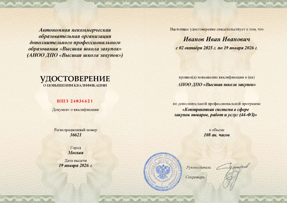 Данный курс повышения квалификации, содержащий 40 академических часов обучения, разработан для специалистов, ответственных за приемку результатов исполнения госконтрактов. Обучение проходит дистанционно в Ижевске. Программа детально разбирает правовой регламент приемки по 44-ФЗ, правила оформления актов, методики разрешения споров и вопросы юридической ответственности сторон. Аттестация максимально упрощена: онлайн-тест до 10 вопросов без лимитов по времени и числу заходов, что позволяет 99% слушателей успешно завершить курс с первой попытки. Подготовка рефератов или защита работ не требуются. Мониторинг рынка подтверждает, что это самое выгодное ценовое предложение. Удостоверение оформляется за 1 день, а сведения в ФРДО вносятся непосредственно в день выдачи.